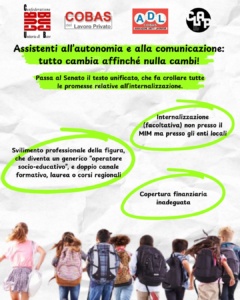 Spariscono i riferimenti al MIM e si demanda agli enti locali l’internalizzazione (peraltro facoltativa) della figura dell’assistente all’autonomia e alla comunicazione, in un Paese dove il dissesto finanziario dei comuni è sotto gli occhi di tuttə. Non si prevedono finanziamenti e fondi dedicati, costruendo quindi un contenitore vuoto che nessuno riempirà. Si sminuisce la figura professionale dell’assistente all’autonomia e alla comunicazione, già spezzettata tra decine di denominazioni e funzioni differenti in tutta Italia, facendo riferimento a un generico “operatore socio-educativo”. Si prevedono infine diversi percorsi formativi per l’acquisizione della qualifica, che vanno dalla laurea ai corsi regionali, sminuendo ancora di più la professionalità di lavoratrici e lavoratori.