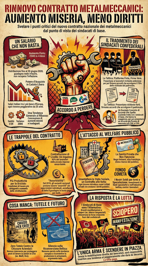Il recente rinnovo del contratto dei metalmeccanici è l’ennesimo capitolo di una strategia che mira a impoverire chi lavora, mascherando con paroloni una realtà fatta di salari da fame e smantellamento dei diritti. Mentre l’inflazione morde e il costo della vita galoppa, le direzioni sindacali di CGIL, CISL e UIL firmano un accordo che ci lega le mani fino al 2028, confermando un modello che serve solo ai padroni.