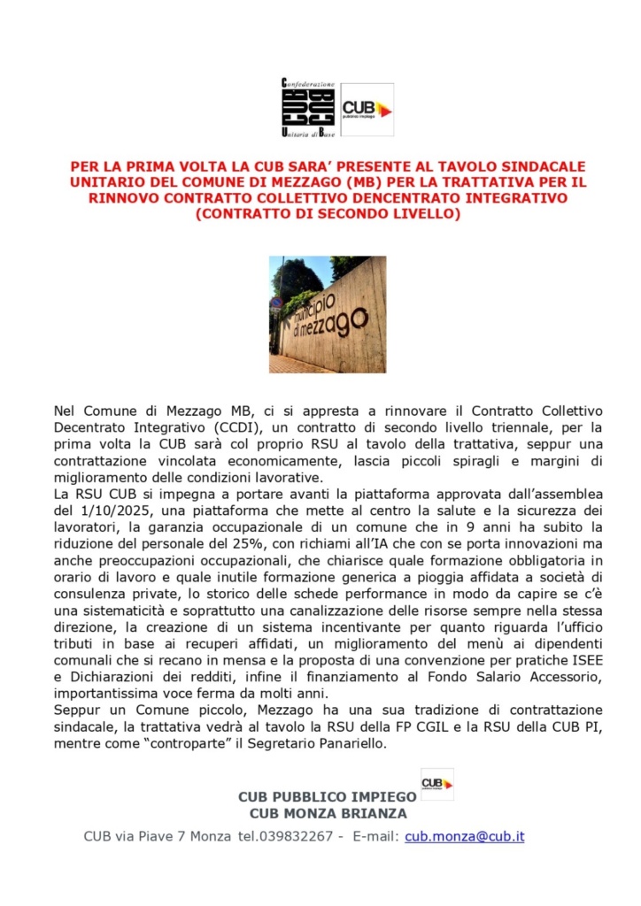 Cub PI a Mezzago (Mb) al tavolo sindacale unitario