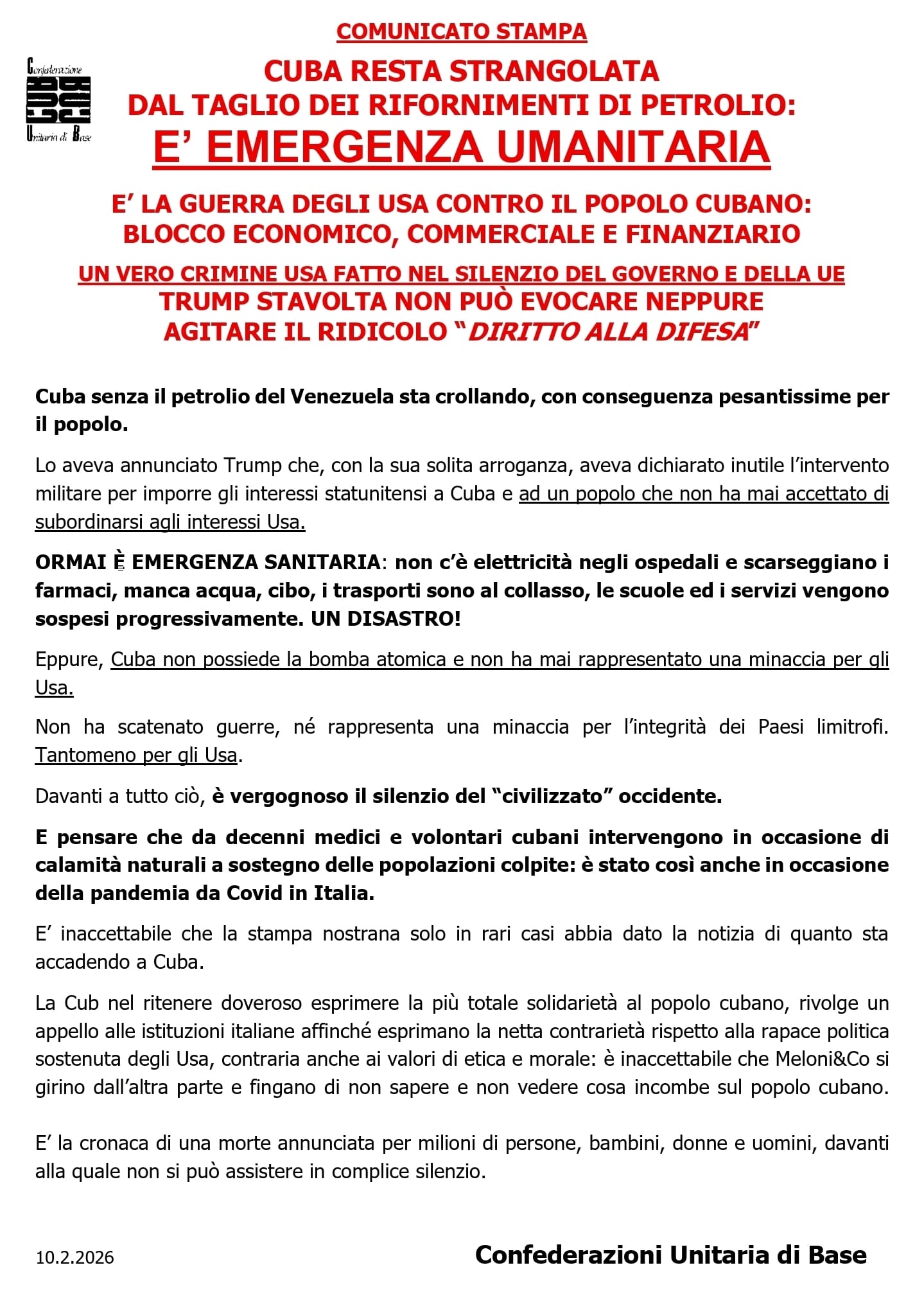 La Cub nel ritenere doveroso esprimere la più totale solidarietà al popolo cubano, rivolge un appello alle istituzioni italiane affinché esprimano la netta contrarietà rispetto alla rapace politica sostenuta degli Usa, contraria anche ai valori di etica e morale: è inaccettabile che Meloni&Co si girino dall’altra parte e fingano di non sapere e non vedere cosa incombe sul popolo cubano.