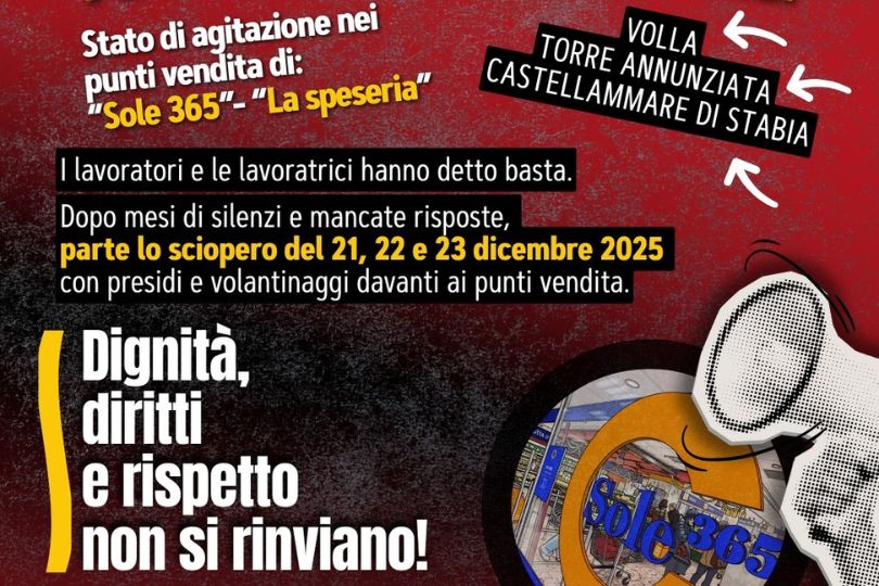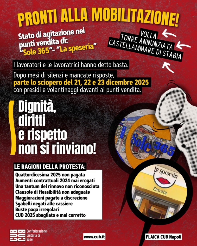 FLAICA CUB NAPOLI: Proclamazione dello stato di agitazione nei punti vendita di “Sole365” di Volla e Torre Annunziata e “La Speseria” di Castellammare di Stabia della provincia di Napoli – Comunicato Stampa
