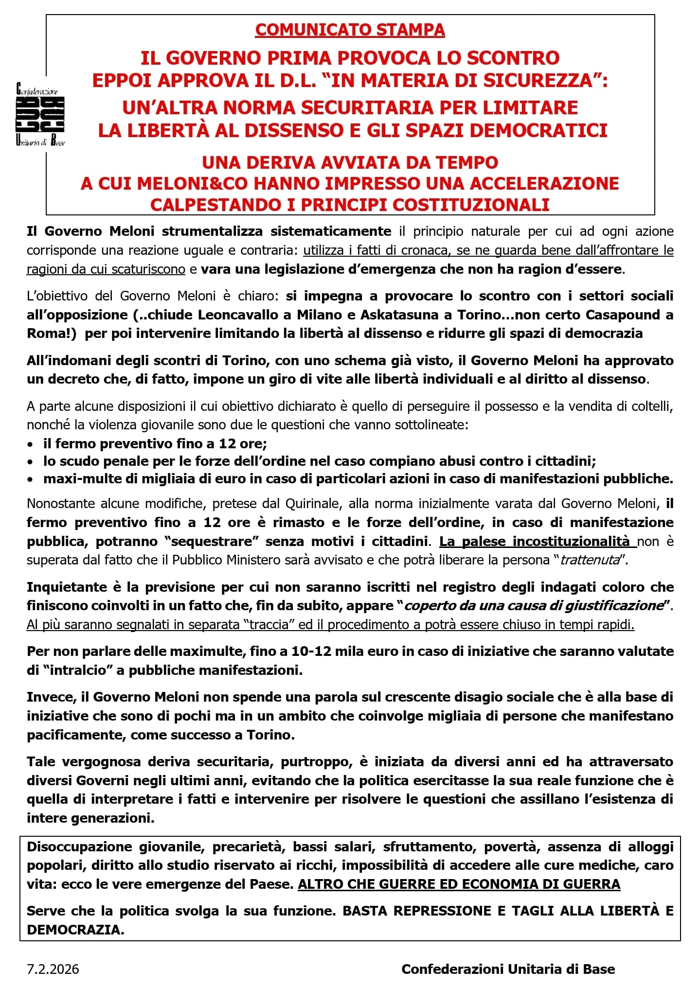7.2.2026 Confederazioni Unitaria di Base
