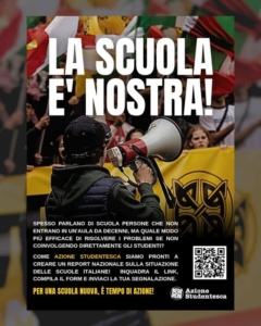 “Siamo pronti a redigere un rapporto sulla situazione nelle scuole italiane”, promette Azione studentesca nel suo programma, e chiede agli studenti di compilare un questionario: “Hai uno o più professori di sinistra che fanno propaganda durante le lezioni? Quali sono stati i casi più emblematici?”.
