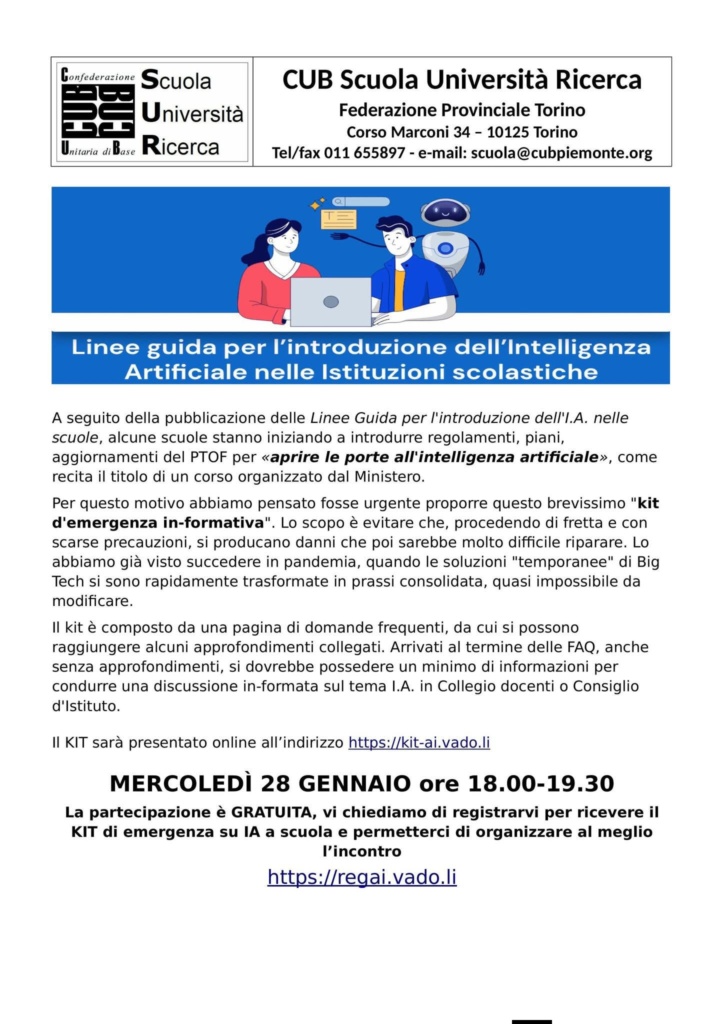 Intelligenza artificiale a scuola: prevenire è meglio che curare 2 ore ago Sur Mercoledì 28 gennaio ore 18-19.30 appuntamento on line per ricevere il KIT di emergenza su AI e Scuola. La partecipazione è gratuita ma è richiesta l’iscrizione per consentire agli organizzatori di preparare l’incontro al meglio.Link per registrarsi all’incontroLink a cui sarà presentato il KIT