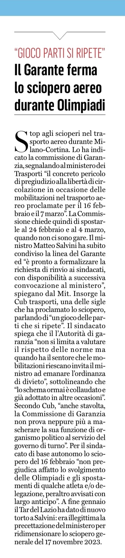 Lo Sciopero del 16 febbraio in tutto il Comparto del Trasporto Aereo-Aeroportuale e l’astensione sugli aeroporti di Linate e Malpensa, ambedue proclamate dalla Cub Trasporti, non pregiudicano affatto lo svolgimento delle Olimpiadi e gli spostamenti di qualche atleta e/o delegazione, peraltro avvisati con largo anticipo delle iniziative indette, a fronte del preavviso obbligatorio con cui si devono proclamare.