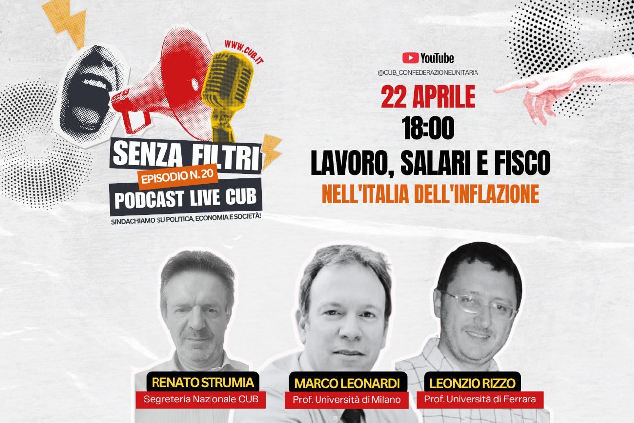 Mercoledì 22 aprile ore 18: “Lavoro, salari e fisco nell’Italia dell’inflazione“. Con il prof. Marco Leonardi (Università di Milano) e il prof. Leonzio Rizzo (Università di Ferrara), autori del libro “Il prezzo nascosto”. Conduce Max Rigano, con la collaborazione di Renato Strumia (CUB).