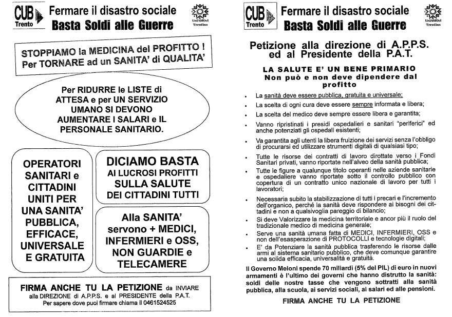 Petizione Cub Trento sulla sanità pubblica 2 ore ago Sanità SCARICA QUI LA PETIZIONE E FAI GIRARE;PAGINA DA STAMPARE E DISTRIBUIRE, PER LA RACCOLTA FIRME.