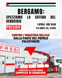 Nel giorno del presidio USB Bergamo e CUB Bergamo erano presenti insieme a numerose realtà sociali e territoriali. Durante gli interventi al megafono abbiamo espresso in modo esplicito e inequivocabile la nostra solidarietà ai lavoratori e alle lavoratrici della Fassi, chiarendo che l’iniziativa non era contro di loro, ma contro ogni forma di coinvolgimento diretto o indiretto nei meccanismi economici e produttivi che alimentano guerra, occupazione militare e violazioni dei diritti del popolo palestinese.