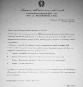 L’8 gennaio l’Ufficio Scolastico Regionale per il Lazio – Ufficio VI Ambito Territoriale di Roma invia ai dirigenti delle istituzioni scolastiche di Roma e provincia una circolare avente ad oggetto “Rilevazione alunni/studenti palestinesi a.s. 2025/26”.