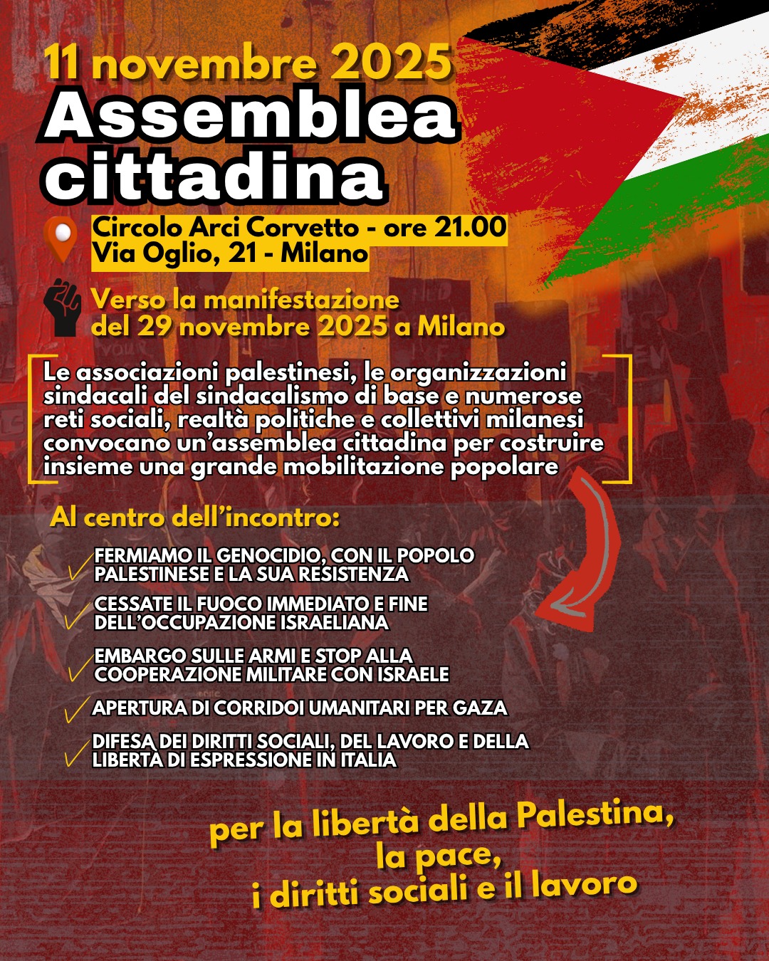Verso la manifestazione del 29: Assemblea cittadina a Milano l’11 novembre 3 ore ago Internazionale, Sciopero generale VERSO LA MANIFESTAZIONE DI SABATO 29 NOVEMBRE A MILANOMARTEDI’ 11 NOVEMBRE ASSEMBLEA CITTADINA ALLE ORE 21, presso il Circolo Arci Corvetto, in via Oglio 21 a Milano VAI AL VIDEO E FAI GIRARE